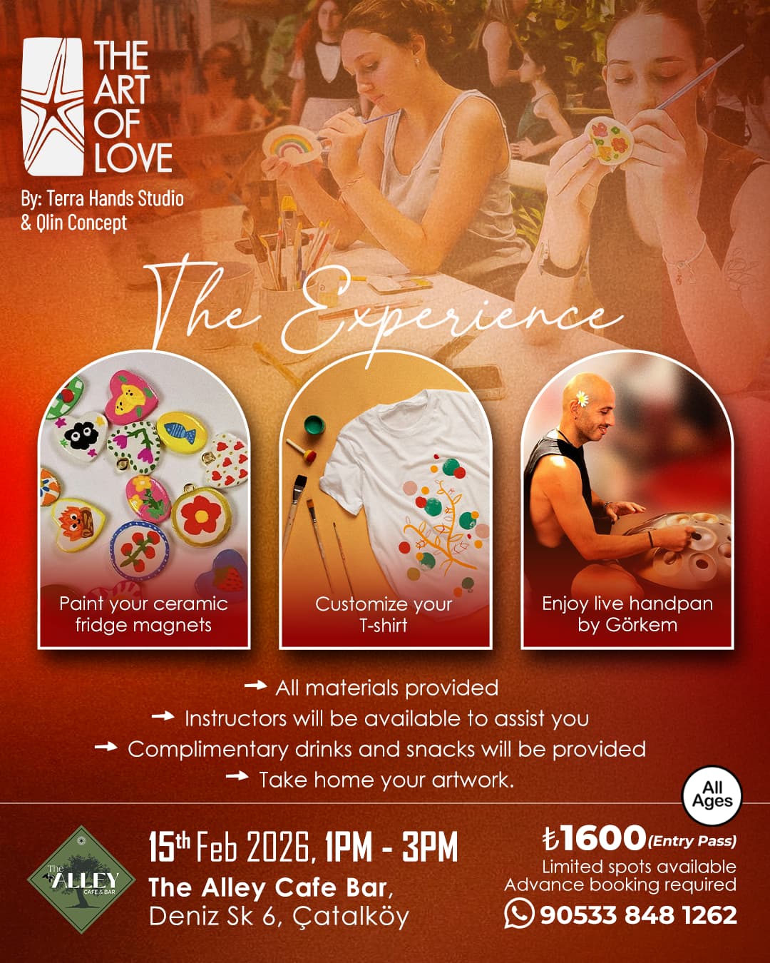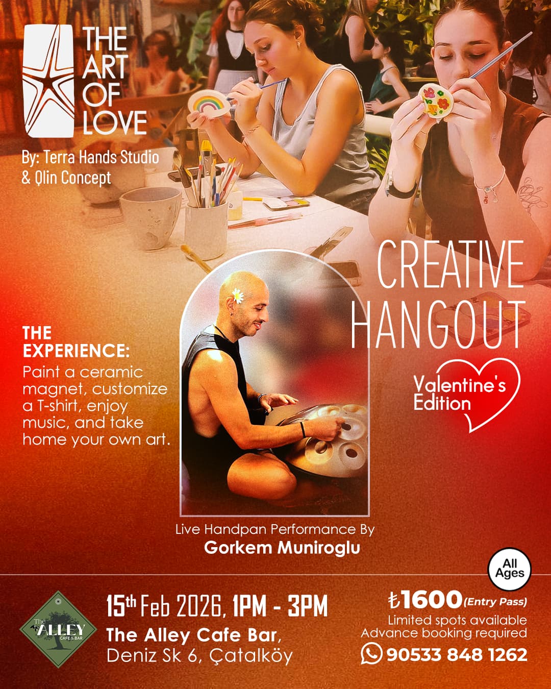 The creative flow of the day will be accompanied by a live handpan performance by Görkem Müniroglu, adding a soft and atmospheric soundscape to the space. The music supports calm focus and emotional openness while you create. Complimentary drinks and snacks will be provided so you can relax, recharge, and enjoy the moment fully. The event takes place at The Alley Cafe Bar in Catalkoy, Northern Cyprus, a cozy and beautiful location that supports the creative and social nature of the hangout.